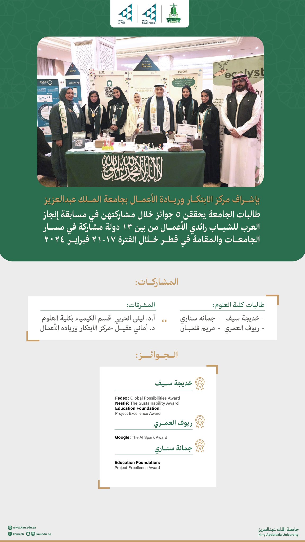طالبات جامعة_الملك_عبدالعزيز يحققن ٥ جوائز في مسابقة إنجاز العرب للشباب ورواد الأعمال